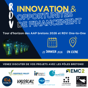 Ne manquez pas les ateliers « Emergence de projets » proposés par les pôles de compétitivité en partenariat avec les technopoles bretons pour découvrir les futurs appels à projets (AAP R&D collaborative au croisement des filières de la Région Bretagne, I-Demo régionalisé, I-Demo), les opportunités de financement et échanger avec vos futurs partenaires et les acteurs susceptibles de vous accompagner dans le montage de vos projets. Deux ateliers en ligne sont proposés les 25 ou 31 janvier.