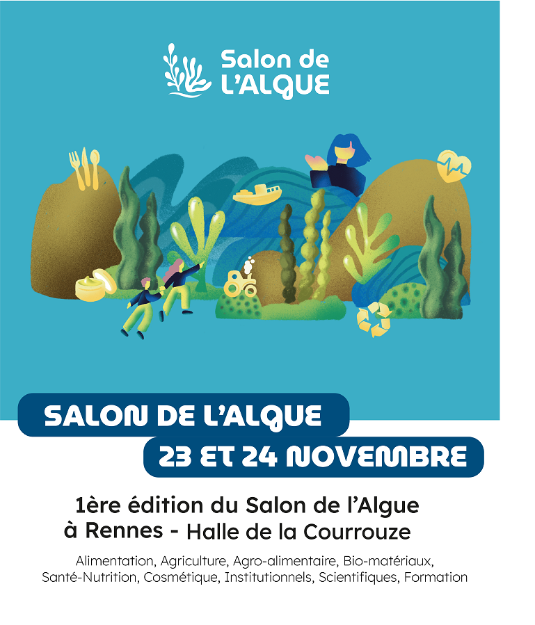 Nous aurons le plaisir de participer au premier salon de l’algue à Rennes, les 23 et 24 novembre. Porté par un collectif d’acteurs engagés, cet événement a pour ambition de mettre en lumière toute la richesse des algues et la diversité de leurs usages (alimentation, nutrition santé, cosmétique, matériaux…), en réunissant les acteurs des filières : chercheurs, producteurs, artisans, industriels…